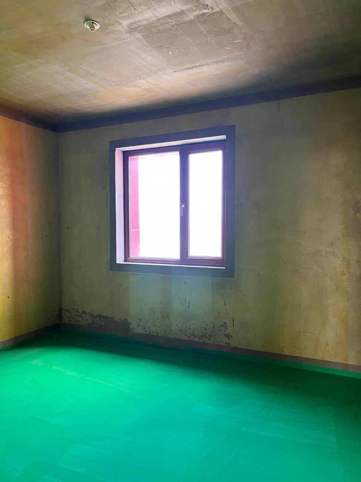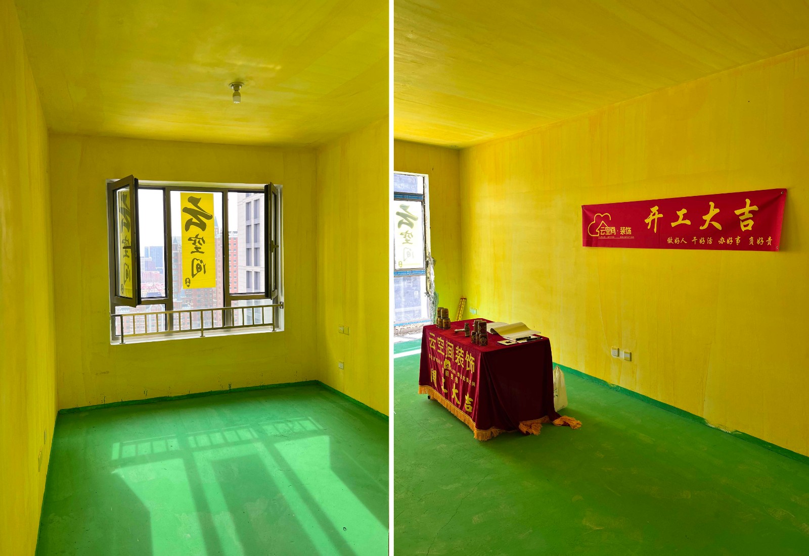 很多工地都會給墻面和地面涂成這樣黃黃綠綠的樣子,這些黃黃綠綠的涂料就是墻固和地固,墻固和地固本質(zhì)上是屬于無甲醛環(huán)保型的界面膠,是膠水的一種類型。